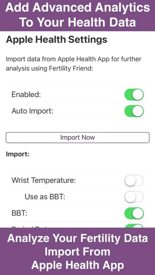 Apple Health App: You can import data from Apple Health App into Fertility friend for further analysis. Tap more menu/settings/Health App Settings to set it up.