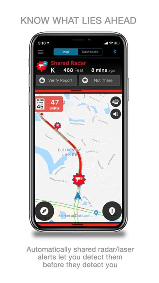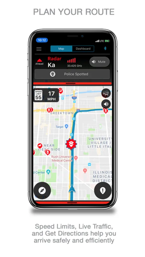 • Community-based alerts to upcoming ‘Police Spotted’ speed traps, accidents, work zones, road hazards, detours, and traffic jams