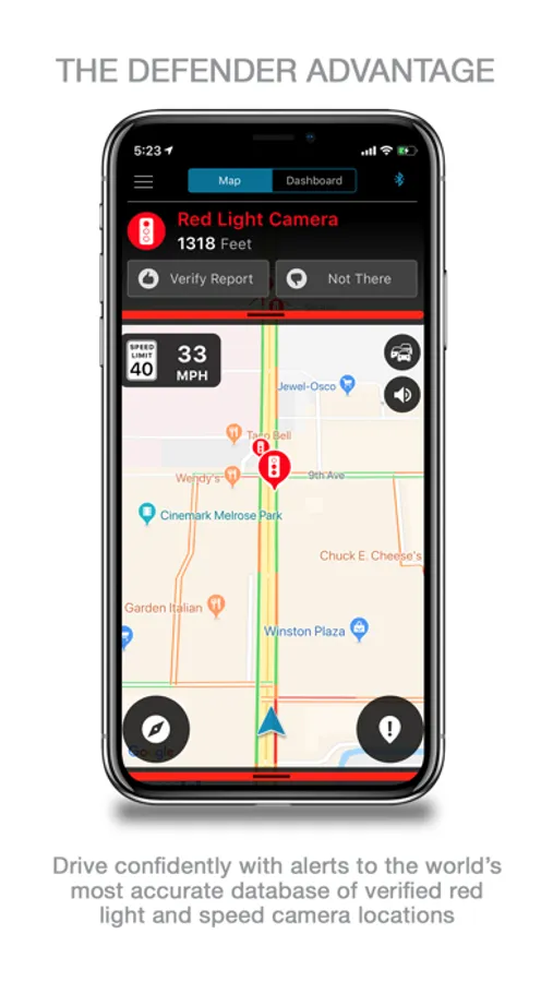 • Verified alerts from Defender®, the world’s largest database of red light, speed, and mobile cameras