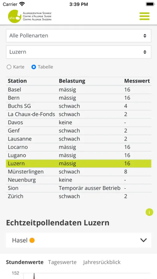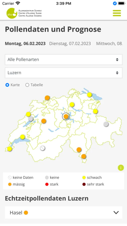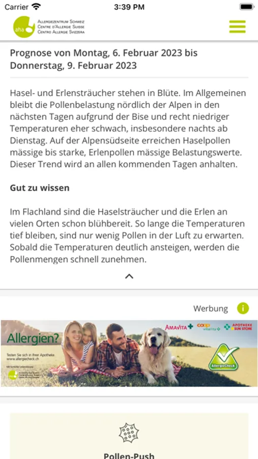 Die «Pollen-News» App informiert Sie in Echtzeit über die Pollenbelastung in der Schweiz. Sie sehen live, wie stark die aktuelle Belastung unterschiedlicher Pollenarten an der von Ihnen ausgewählten Messstation ist. Mit wie vielen Pollen in den beiden darauffolgenden Tagen zu rechnen ist, erfahren Sie in der Pollenprognose. Plus: Sie können Ihren persönlichen Pollen-Push (Pollenart/Region) einrichten. Nimmt der Belastungswert der gewählten Pollenart zu, erhalten Sie eine Push-Nachricht. Weiter in der App: wichtige Tipps im Umgang mit der Pollenallergie und Angebote von aha!Allergiezentrum Schweiz. Die Polleninformationen stammen vom Bundesamt für Meteorologie