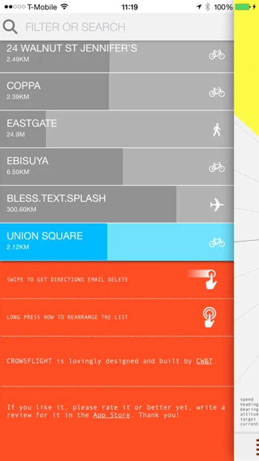 -Location list view shows your relative distance to each location, so you can see how places compare (distances are scaled logarithmically, so shorter distances show greater difference)