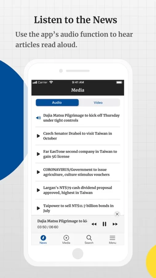 The updated app maintains a similar look to the Focus Taiwan website, but also has a "Media" section, which includes a playlist of the latest 30 news stories in audio and video formats.