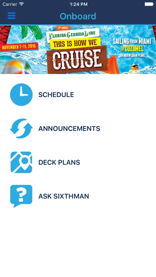 Easy access to onboard schedules, festival announcements Deck Plans and Ask Sixthman