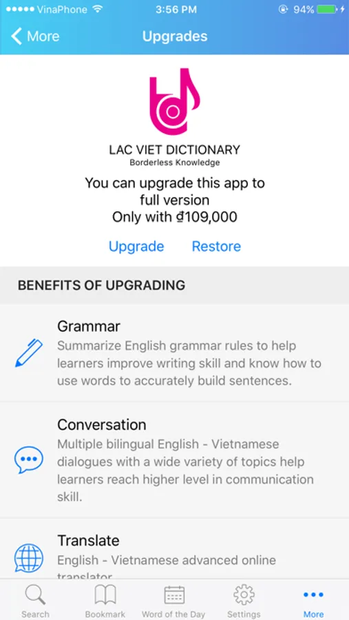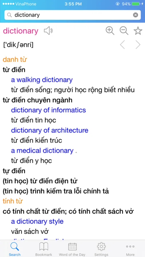 - Each item has its pronunciation (connect with the Internet to use this utility when looking up Vietnamese word), transcription, meanings, examples, compound words, related entries/items…