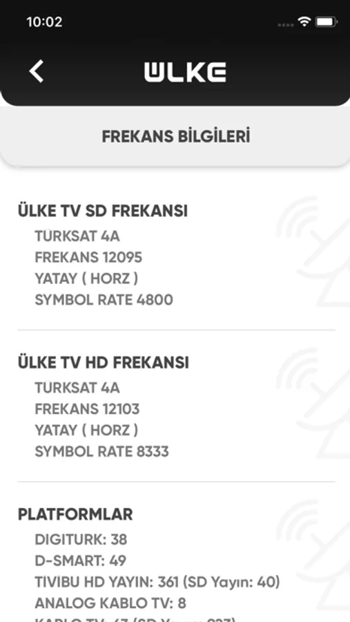 Farklı platformlardan Ülke TV’yi izlemek istediğinizde Teknik Erişim sayfamızda, uydu frekanslarımız, diğer platformlardaki yerlerimizi görebilirsiniz. Ayrıca teknik destek almak isterseniz destek hatlarımızı da aynı sayfada bulabilirsiniz.
