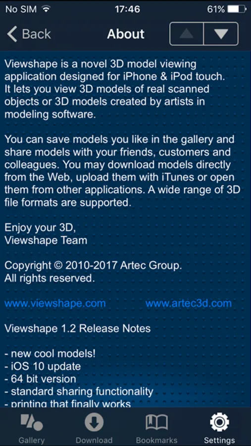 Enjoy our stylish and free 3D viewer designed for iPhone and iPod touch. It lets you have all your 3D models on your mobile device available with a single click as well as download 3D models available on the Internet. You can surf a gallery of real scanned objects as well. You can save models you like in the gallery and share models with your friends, customers and colleagues via email or facebook. You may download models directly from the Web, upload them onto viewshape with iTunes or open them from other applications (such as Mail or Safari). A wide range of 3D file formats are supported.
