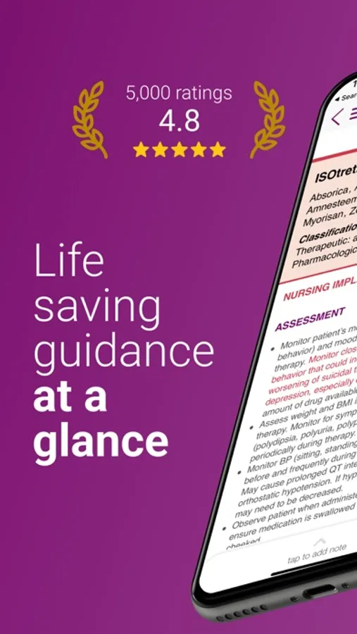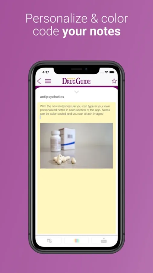 • Take personalized notes throughout the app's drug monographs, color code them; even include images.