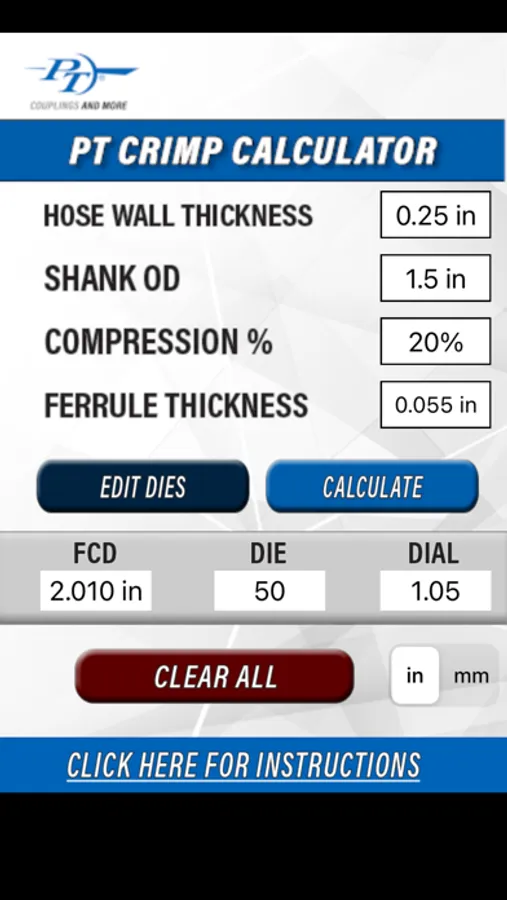 The PT Crimp app lets hose assemblers quickly and accurately determine the final crimp diameter, or FCD, as well as which die and micrometer Dial setting to use for a given hose application. It also provides step by step assembly instructions as a quick reference.