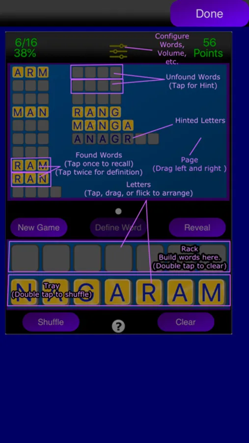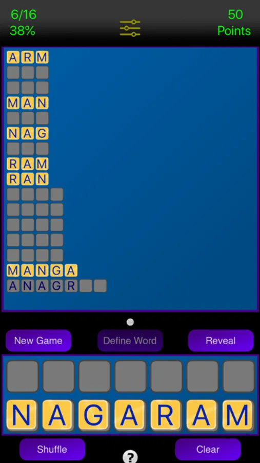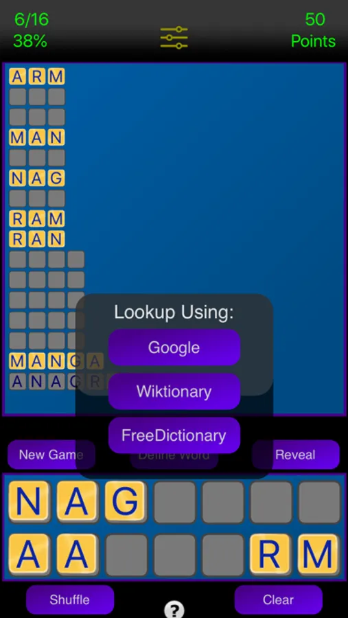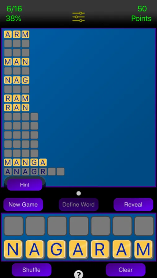 Find all the English words (of three letters or more) that can be formed from the letters of a word. Get hints and look up the definitions of unfamiliar words along the way.