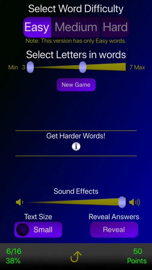 More controls slide down by tapping the Configuration slider icon at the top of the screen. Select Easy, Medium or Hard words, set the minimum and maximum number of letters, and change the sound effects volume.