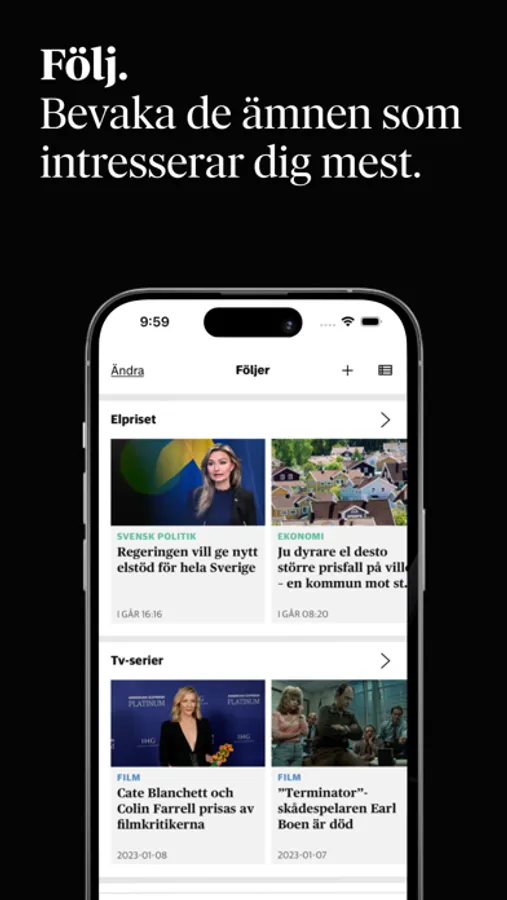 * Bevaka de ämnen som intresserar dig mest och välj hur du vill bli notifierad. I appen eller genom notiser i telefonen.
