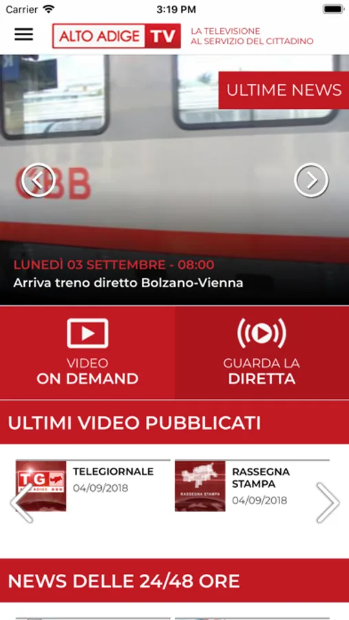 - LiveTV: trasmissione in streaming della diretta del canale AltoAdige TV