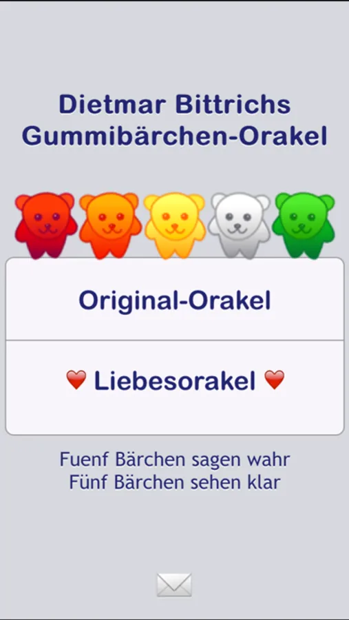 Möchten Sie echte Gummibärchen aus der Tüte deuten lassen? Oder die Deutung per E-Mail senden? Dann ist die App "Bärchen Pro" das Richtige für Sie!