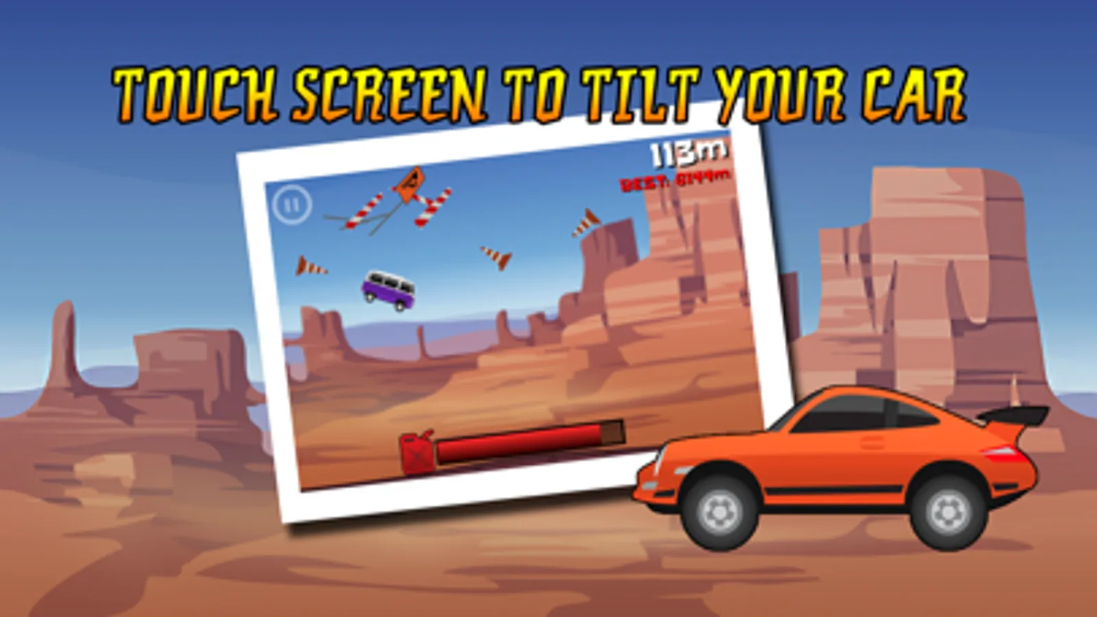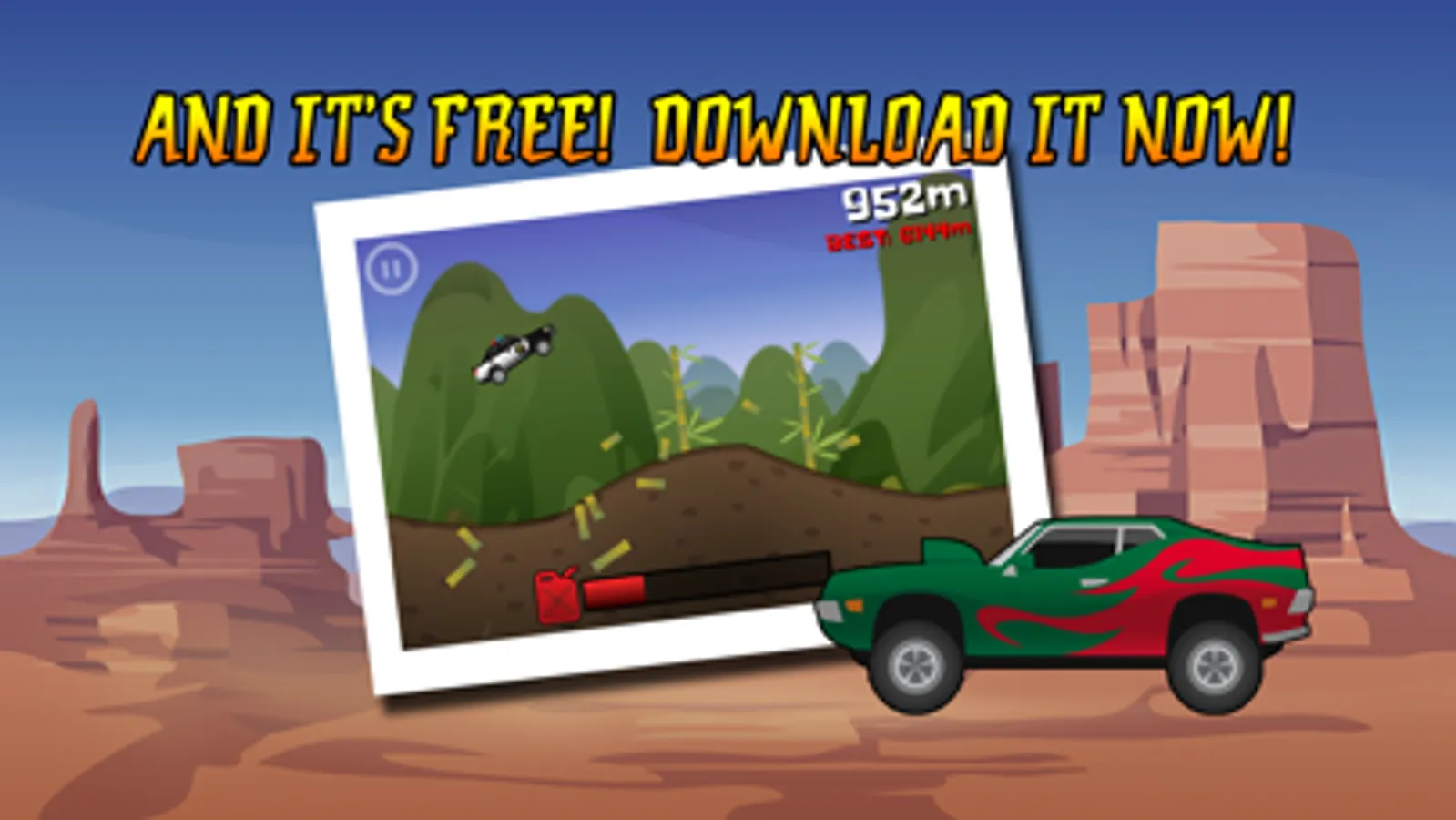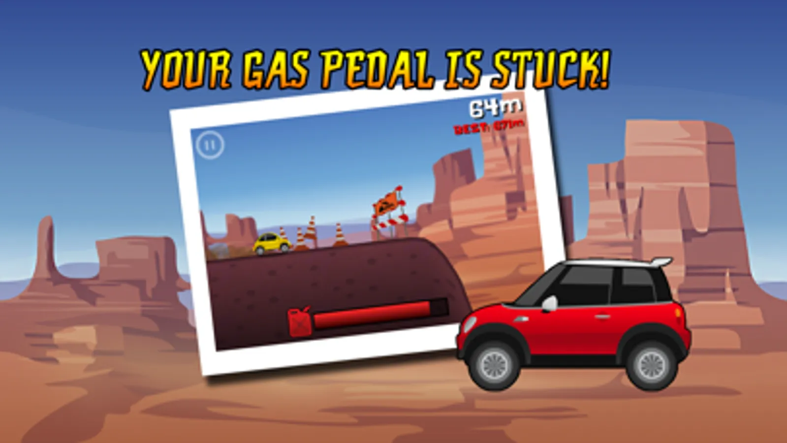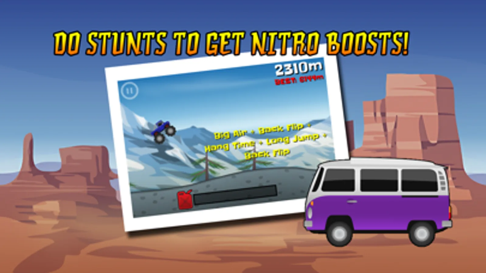 Your gas pedal is stuck! Tilt your car to keep it rolling and jumping. Do stunts to get nitro boost so you can do more stunts to get more nitro boost. It's fun, it's fast and it's free, so get it now!