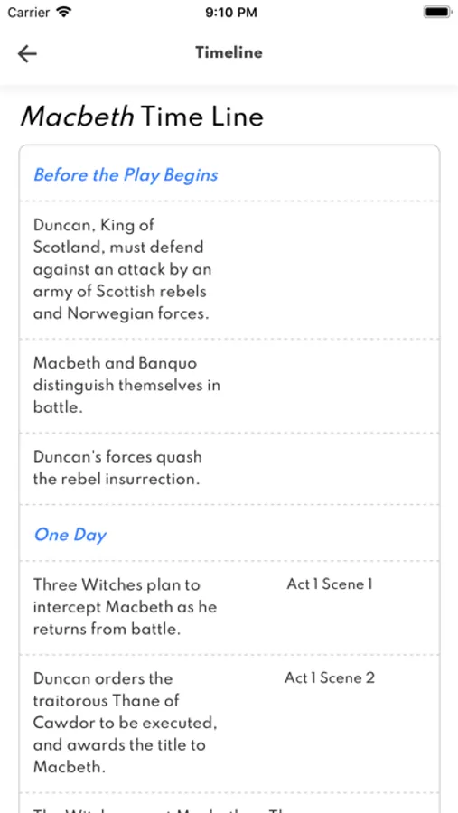 Time line correlating each act and scene to the passage of objective time.