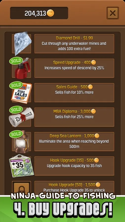 - Earn GOLD to buy lots of super upgrades like katanas, boats, fishing guides & more.