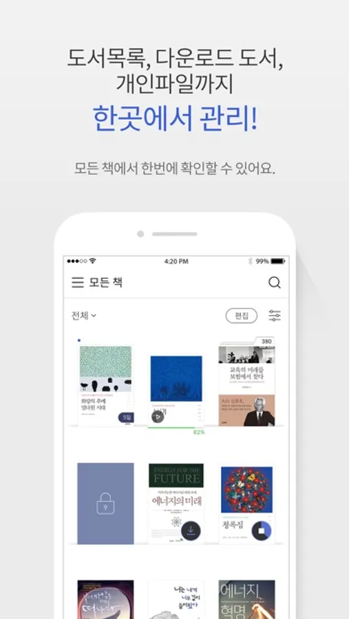 구매 도서 목록, 다운로드한 도서, 직접 올린 파일까지 『모든 책』에서 한번에 확인할 수 있어요.