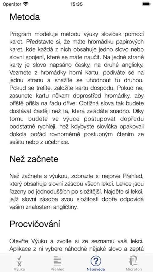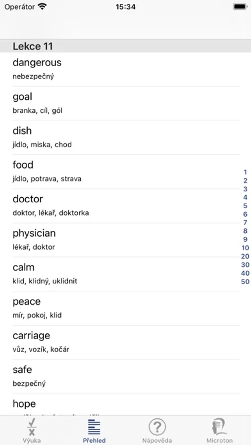 The app contains 50 lessons with 5000 English words or short phrases in total. It aims to cover essential English vocabulary as it is taught at all levels of Czech schools.