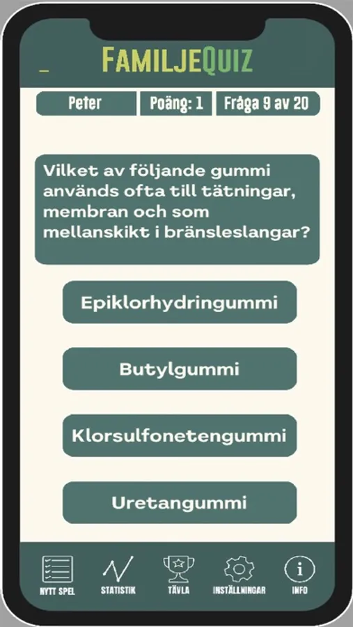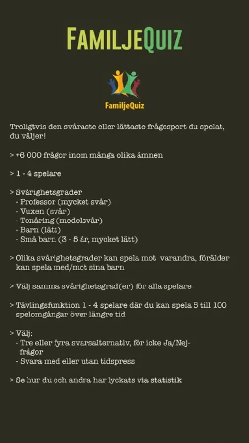 Med FamiljeQuiz får du över 5 900 frågor i olika svårighetsgrader med möjlighet att spela upp till fyra spelare. Väld om du vill ha upp till tre eller fyra svarsalternativ med eller utan tidsgräns för att svara.