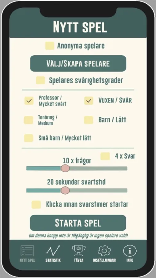 Spela frågesport med familj och vänner med möjlighet att spela vuxen mot barn med frågor med olika svårighetsgrader. Spelet har följande svårighetsgrader som är anpassade till olika svårighetsgrader: