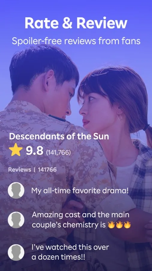 • Rate and Review: Join the discussion and rate shows out of 10. Submit a review to help other Viki users decide if they should watch the show or movie.