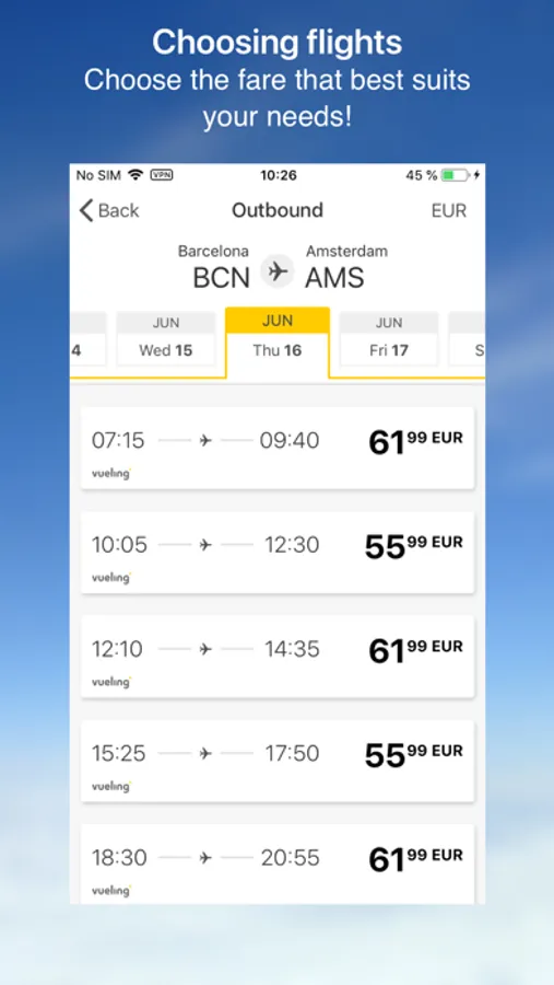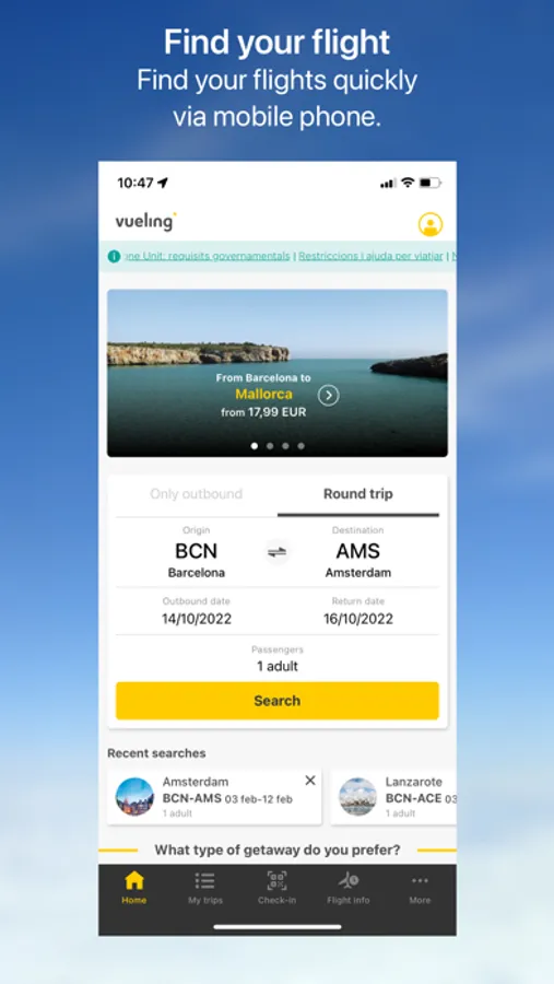 Over 120 destinations await you on the Vueling app. Book cheap flights, choose the fare that best suits your trip and customise it with the most exclusive services.