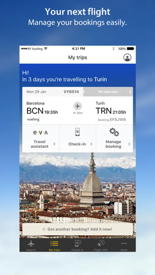 Manage all your bookings easily. Add bags, choose your seat on the plane, change your flight, bring your flight forward... Everything you need at your fingertips.