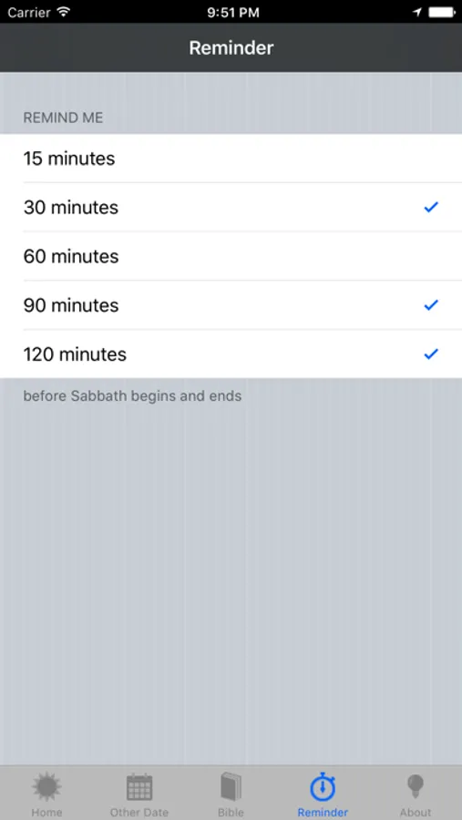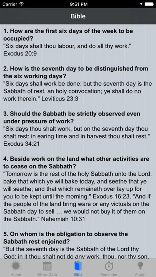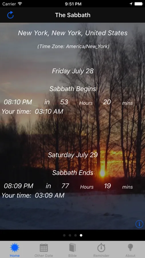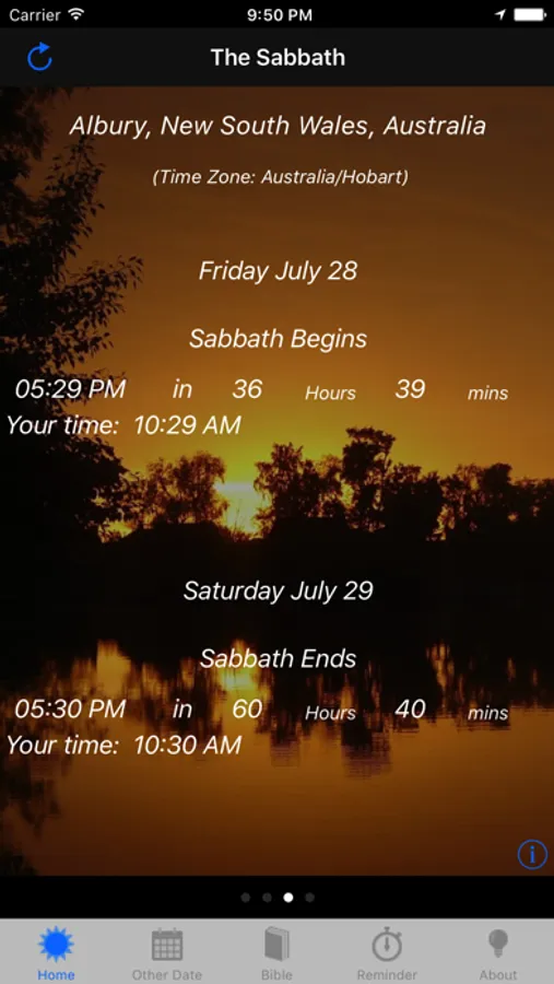 This app will calculate the Sabbath sunset times for Friday evening and Saturday evening each week telling you exactly when Sabbath begins and ends at your current geographic location. It also allows you to choose a specific date in the future or past so you know when Sabbath begins and ends on this date. You can also add multiple locations to this app so you know Sabbath times at your location as well as other locations. You can be reminded before Sabbath begins and ends by a reminder popup. Finally read Bible verses on the topic of the Sabbath from the Word of God.