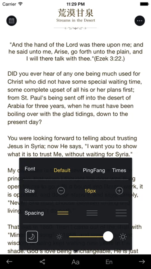The author of ’Streams in the Desert’ is Mrs. Cowman, an American preacher, She and her husband have been working in East Asia for twenty years, in addition to serving in churches of the United states. This book was written by herself when her husband was seriously ill, recorded her spiritual life, and how to use prayer to gain hope, patience and joy in suffering. The book is written in a diary, mainly quoted from the Bible, also introduced other segment of theology, combined with the testimony of the couples and spiritual life to extend deep interpretation for some verses in the Bible. It teaches people how to listen to God by reading the Bible and understand God's will.