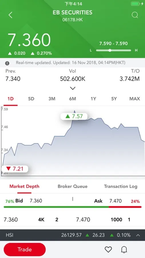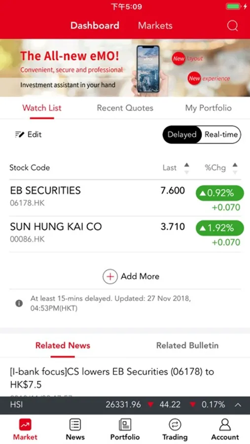 eMO! features real-time stock price snap quoting, Hong Kong stock market information, exclusive market commentary from Everbright Securities International, virtual portfolio and watch list for monitoring the prices of Hong Kong stocks/ETFs/Warrants/CBBCs, interactive charting, top ten stock movers in volume and turnover, major world indices, live exchange rates from EBSI Forex, and price alerts, etc.
