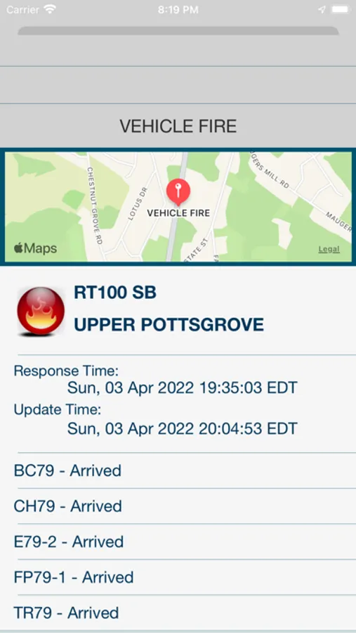 - Detail window describing the nature of the incident, time that it occurred in the local time for the device, location, and easily viewed list of responding units.