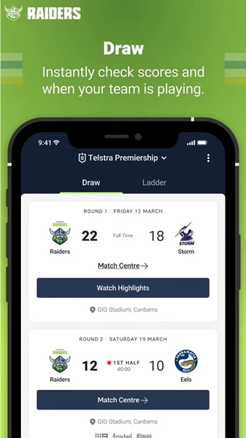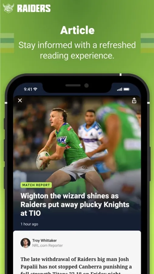 Welcome to the brand new Official Canberra Raiders app. Our completely redesigned experience gives you access to your favourite team and favourite players - plus you'll get breaking Canberra Raiders news, live scores, stats, game day information and match highlights. It's everything you need to know about the Canberra Raiders, no matter where you are.