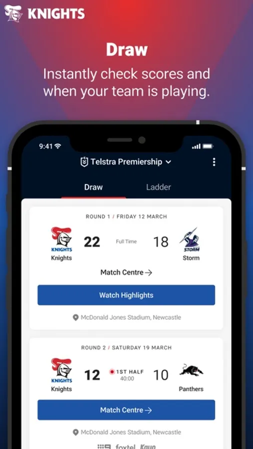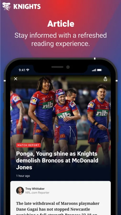 Welcome to the brand new Official Newcastle Knights app. Our completely redesigned experience gives you access to your favourite team and favourite players - plus you'll get breaking Newcastle Knights news, live scores, stats, game day information and match highlights. It's everything you need to know about the Newcastle Knights, no matter where you are.