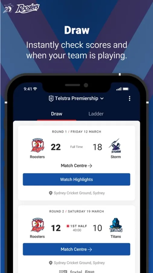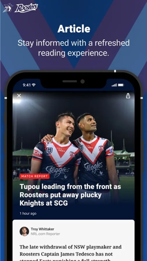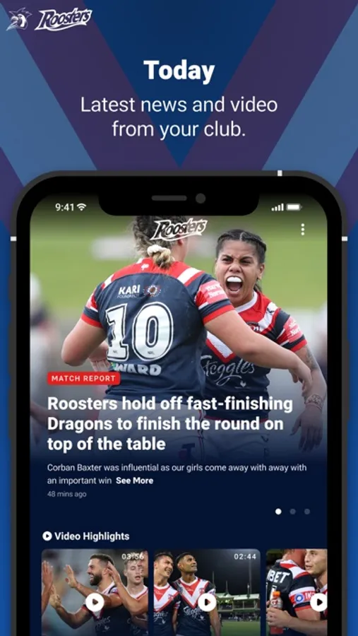 The Official Sydney Roosters app will keep you in the front row. Download now and never miss a minute of the greatest game of all!