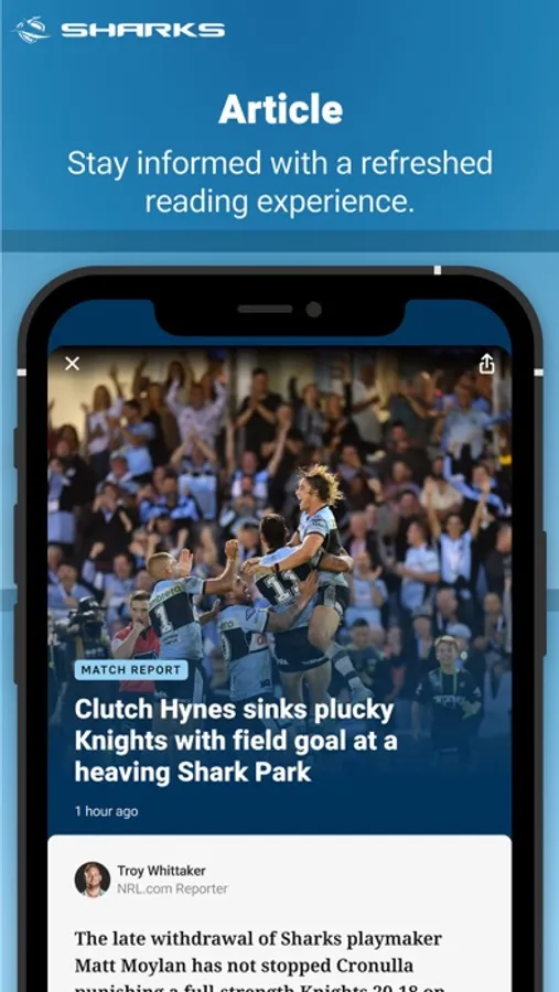 Welcome to the brand new Official Cronulla Sharks app. Our completely redesigned experience gives you access to your favourite team and favourite players - plus you'll get breaking Cronulla Sharks news, live scores, stats, game day information and match highlights. It's everything you need to know about the Cronulla Sharks, no matter where you are.