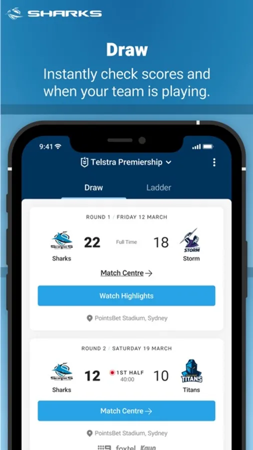 The Official Cronulla Sharks app will keep you in the front row. Download now and never miss a minute of the greatest game of all!