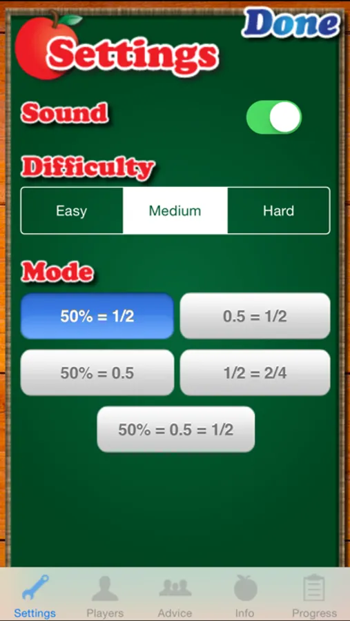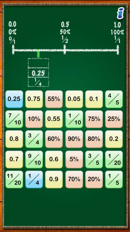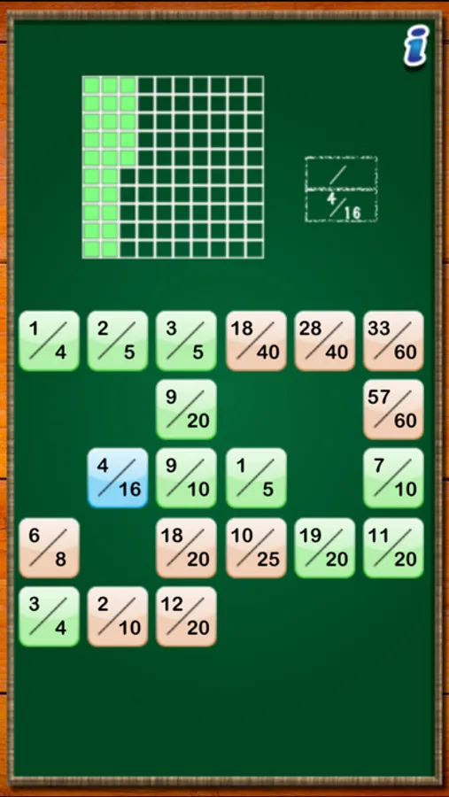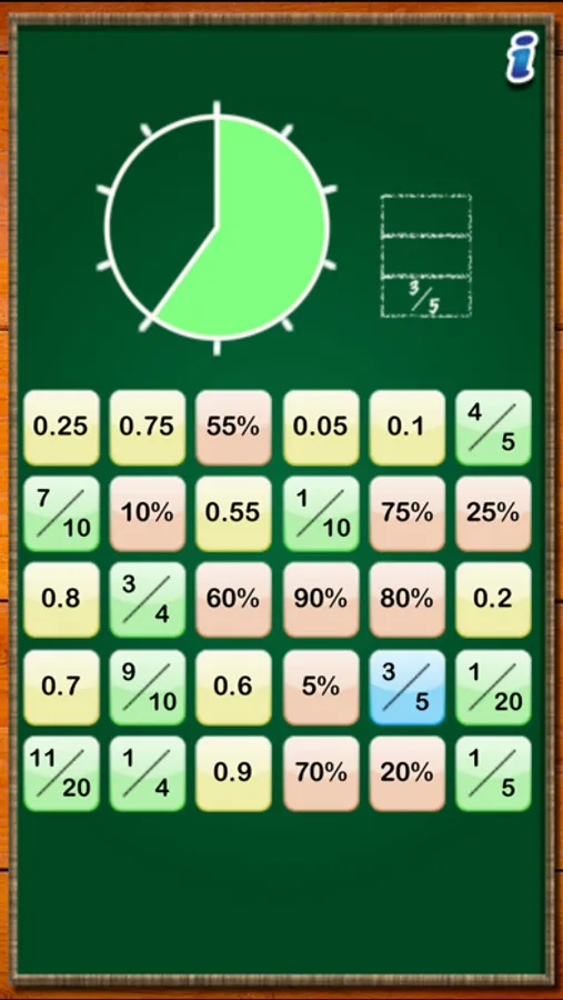 showing equivalent fractions, decimals, and/or percents. To assist the player, the game can display a numberline, a 100-grid or a pie chart showing the value of the initial fraction selected.