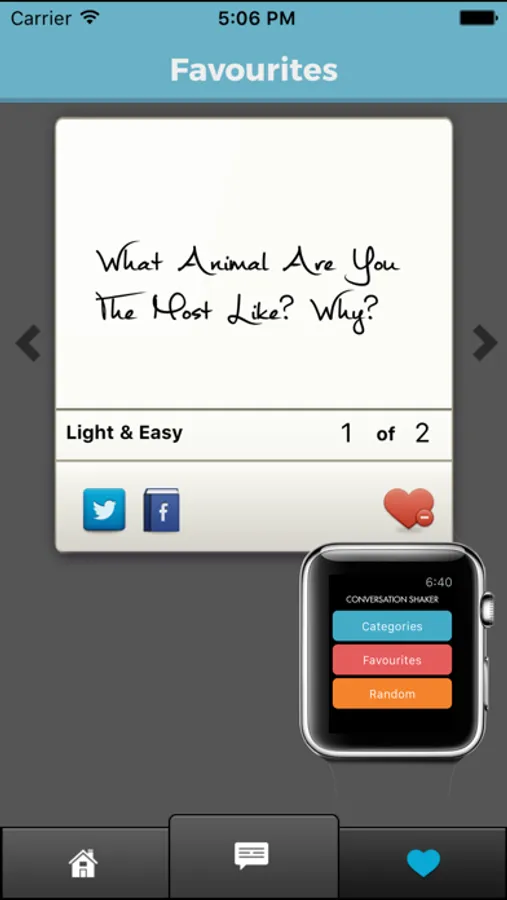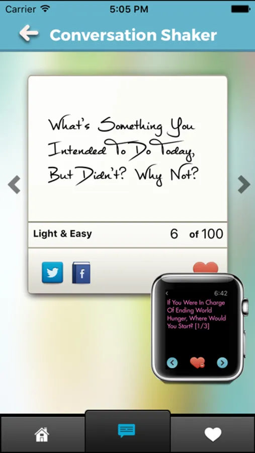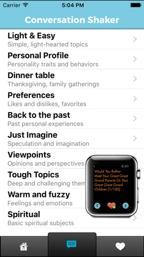 Conversation Shaker provides interesting topics/ice breakers based on different situations. Shake the iPhone to see the next conversation starter.