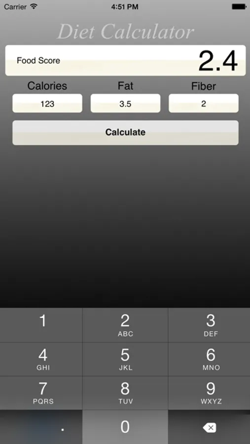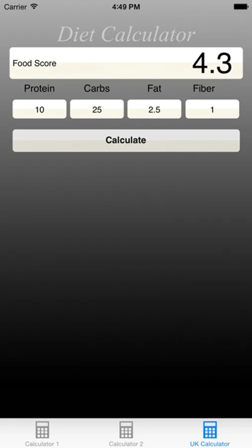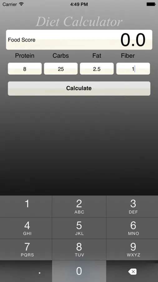 DietCalculator makes balancing your daily food intake a breeze. You simply enter the nutrient values, even fractional ones, of any food that has a nutrition label, and DietCalculator will give you the balanced value in a small number. Such calculations can help, too, with weight loss by simplifying the work of balancing nutrient intake in your diet. With DietCalculator, you can choose between two ways of making such calculations. You can calculate the balance of calories, fat and fiber or of protein, carbohydrates, fat and fiber. Both ways are now available in this single easy-to-use app!!