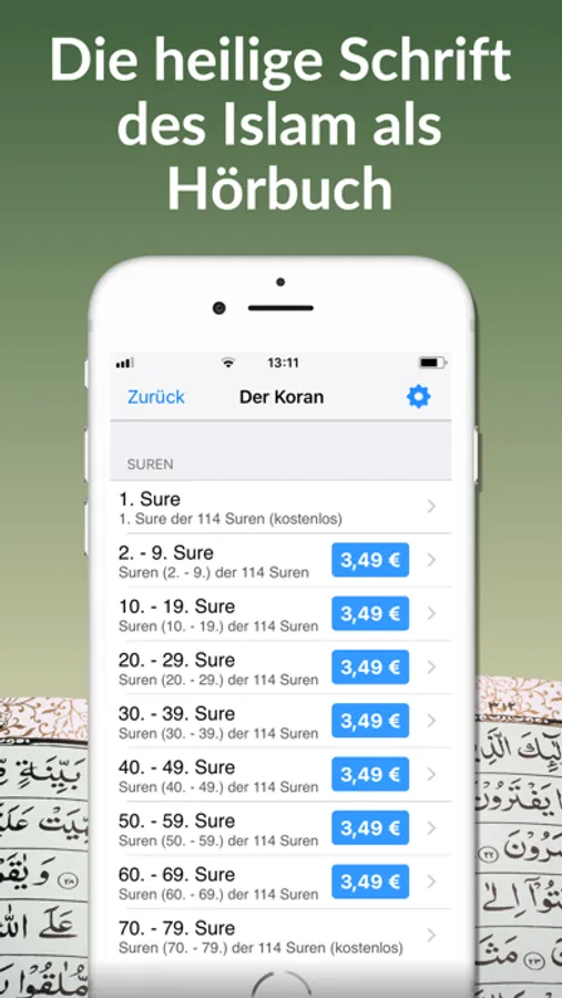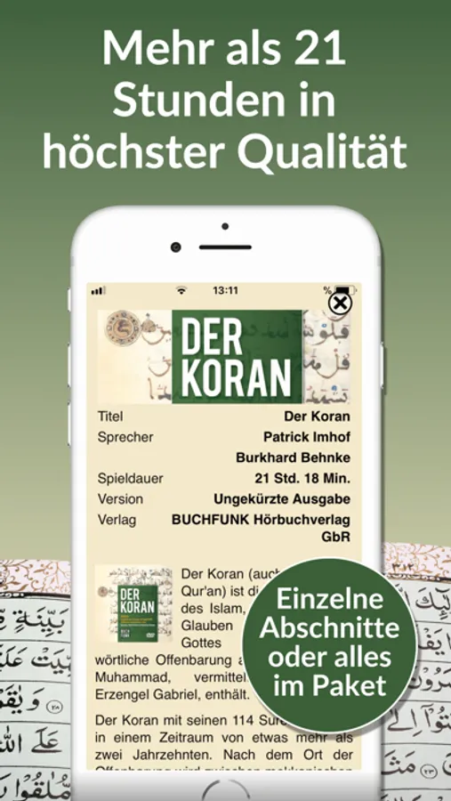 Mit dieser Hörbuch Edition erhalten Sie eine kostenlose Hörprobe (insg. 20 Suren) und die Möglichkeit sich das ganze Hörbuch (oder Teile daraus) zu kaufen.