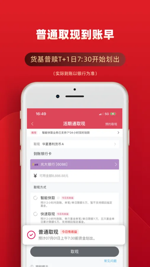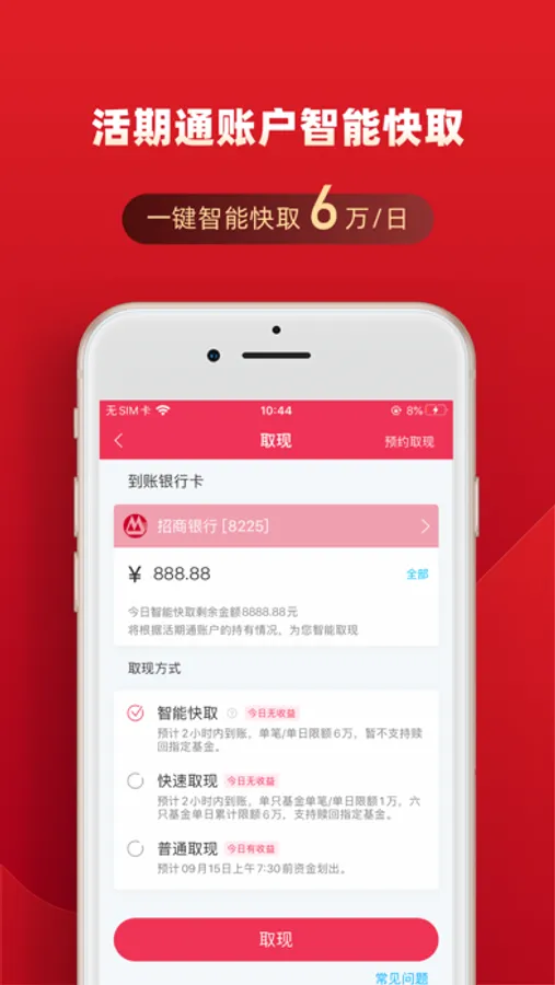 快:活期通(货币基金)实时快取,7X24 无休(每日快速取现最高 6 万,最快 10 秒到账,以银行最终到账时间为准)