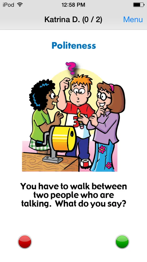 This colorful, educational social skills App for the iPhone®, iPad®, and iPod touch® has all 52 illustrated picture flash cards (plus audio of the text on each card) from the Practicing Pragmatics Fun Deck® by Super Duper® Publications. Select the cards you want students to see, and have them answer social skills questions about Politeness, Solving Problems, Feelings, Giving Information, Requesting, Telephone Skills, and Staying on Topic.