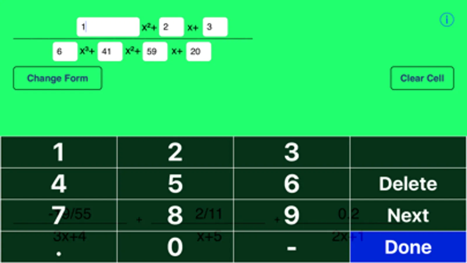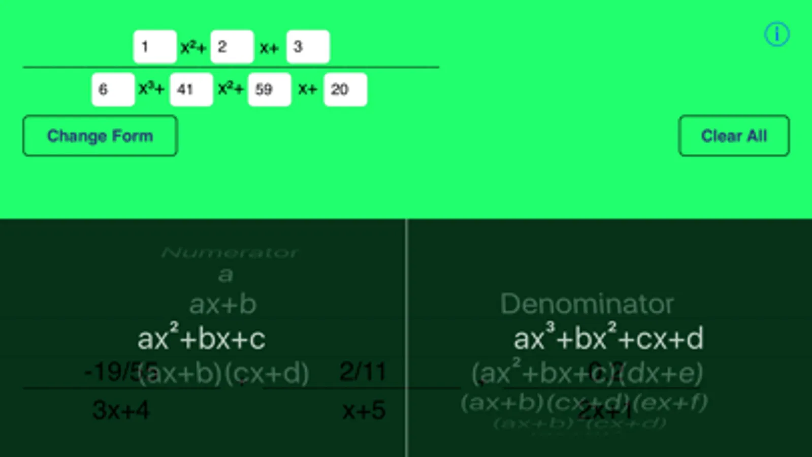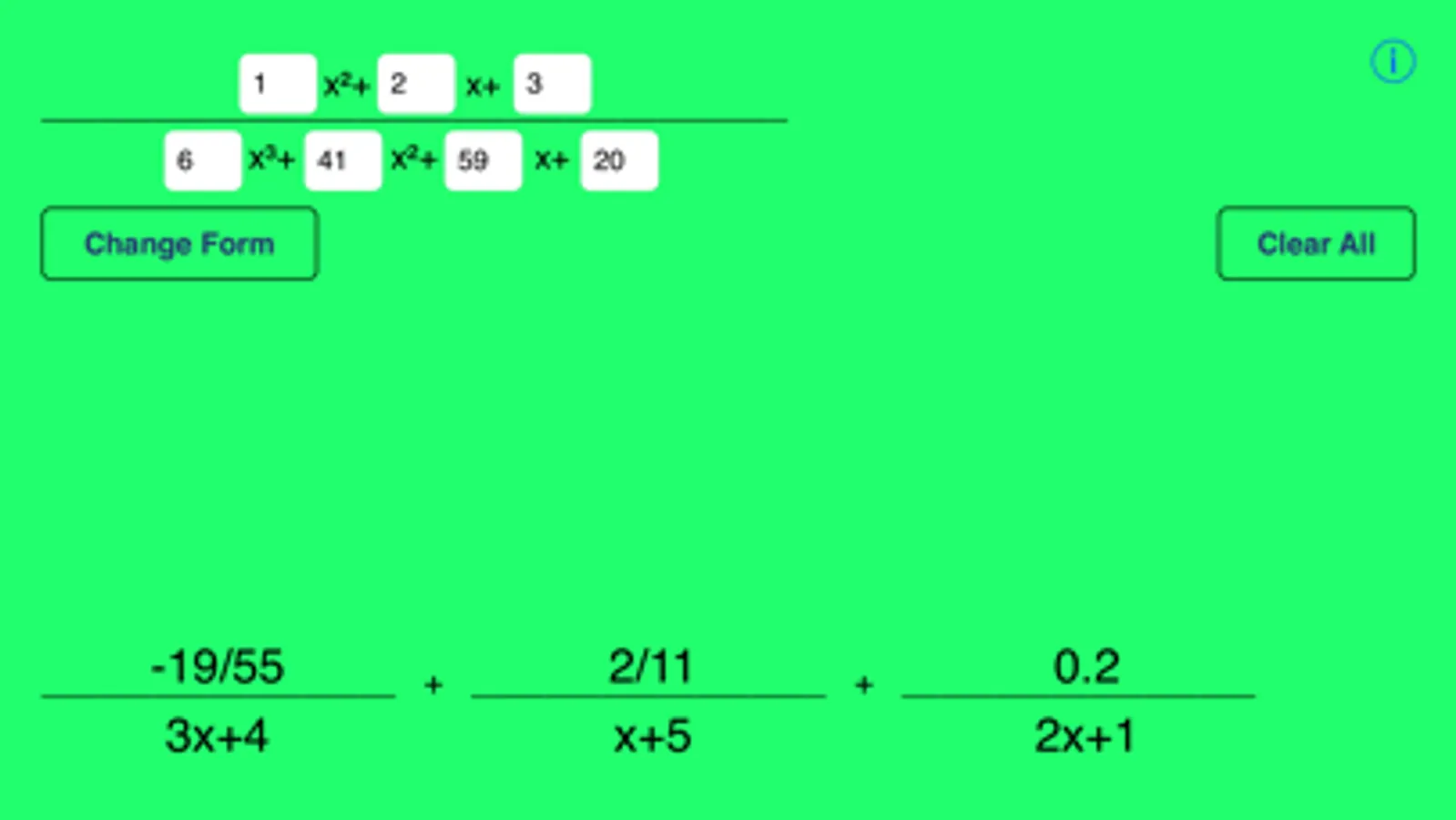Partial Fractions is a handy way to compute partial fraction expansions. It works for 2nd and 3rd order denominators and supports many different input forms (listed below). Supports real and complex answers. It is very useful when trying to integrate fractions.