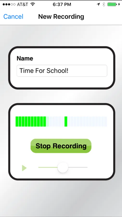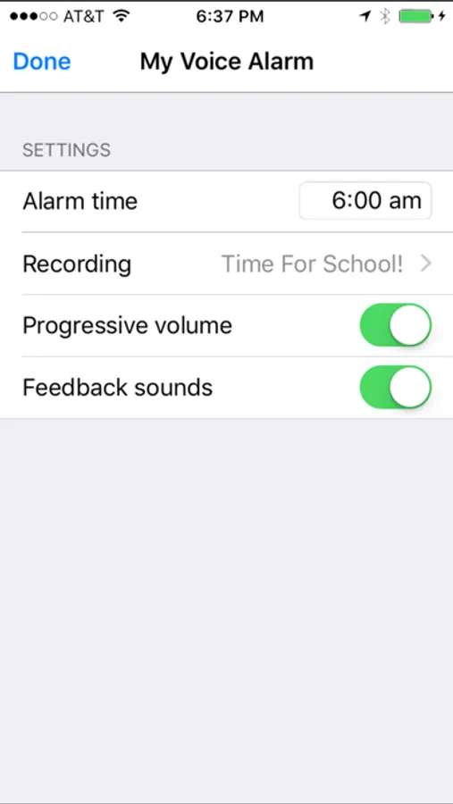 - PROGRESSIVE VOLUME: The volume of my recordings might vary, and the background noise around my house also varies, so other alarms sometimes don't play loudly enough to wake me up. This app includes a volume test button right on the main screen, to compensate for different recording volumes, and an option to increase the alarm volume every minute, in case the background noise in the house is louder when I wake up than it is when I go to bed.