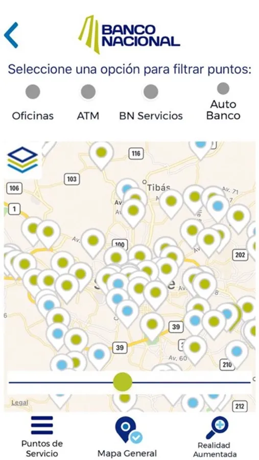 o Localice oficinas, cajeros automáticos y BN Servicios, utilizando mapas interactivos, listas de localización y realidad aumentada.