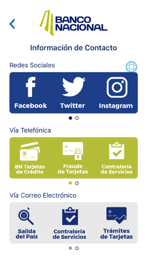 o Acceso a los principales números telefónicos, correos electrónicos y a las redes sociales de Facebook y Twitter del Banco.