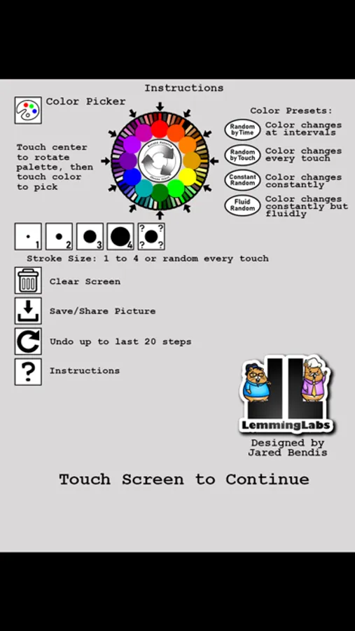 - Draw in Random modes which allows you to have the app randomly change brush sizes every time you lift up your finger or choose one of 4 random color modes.