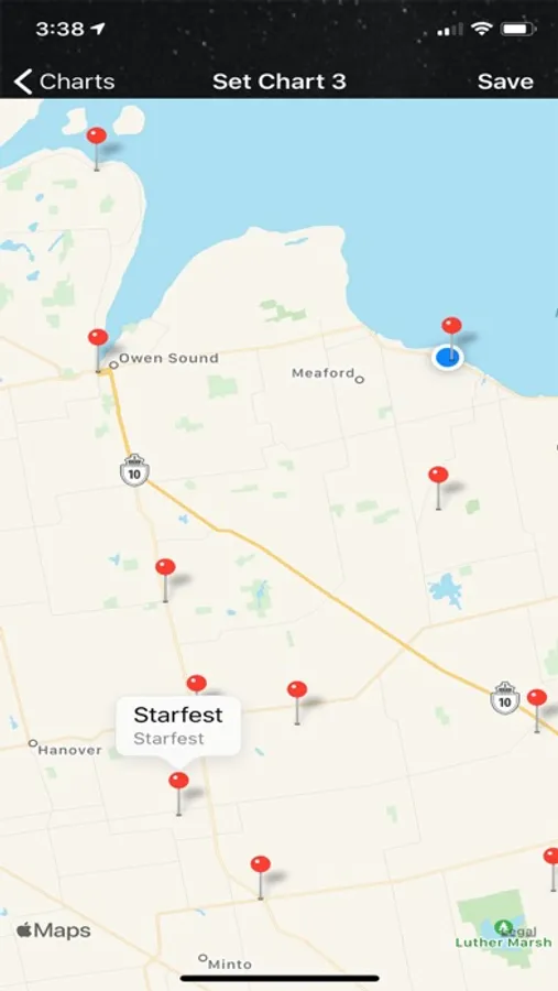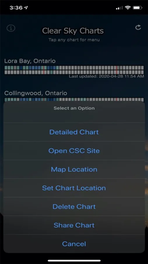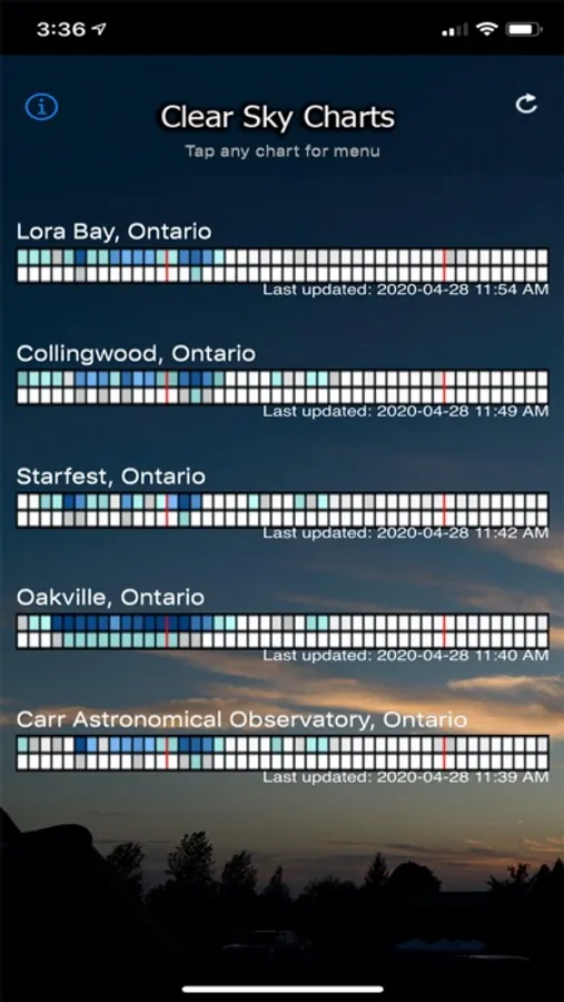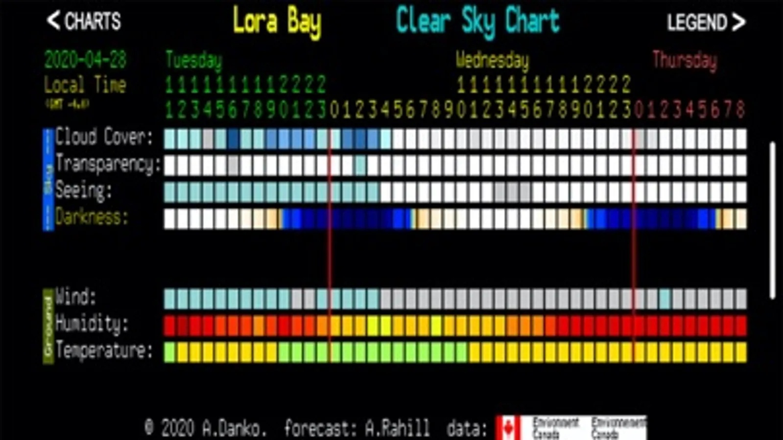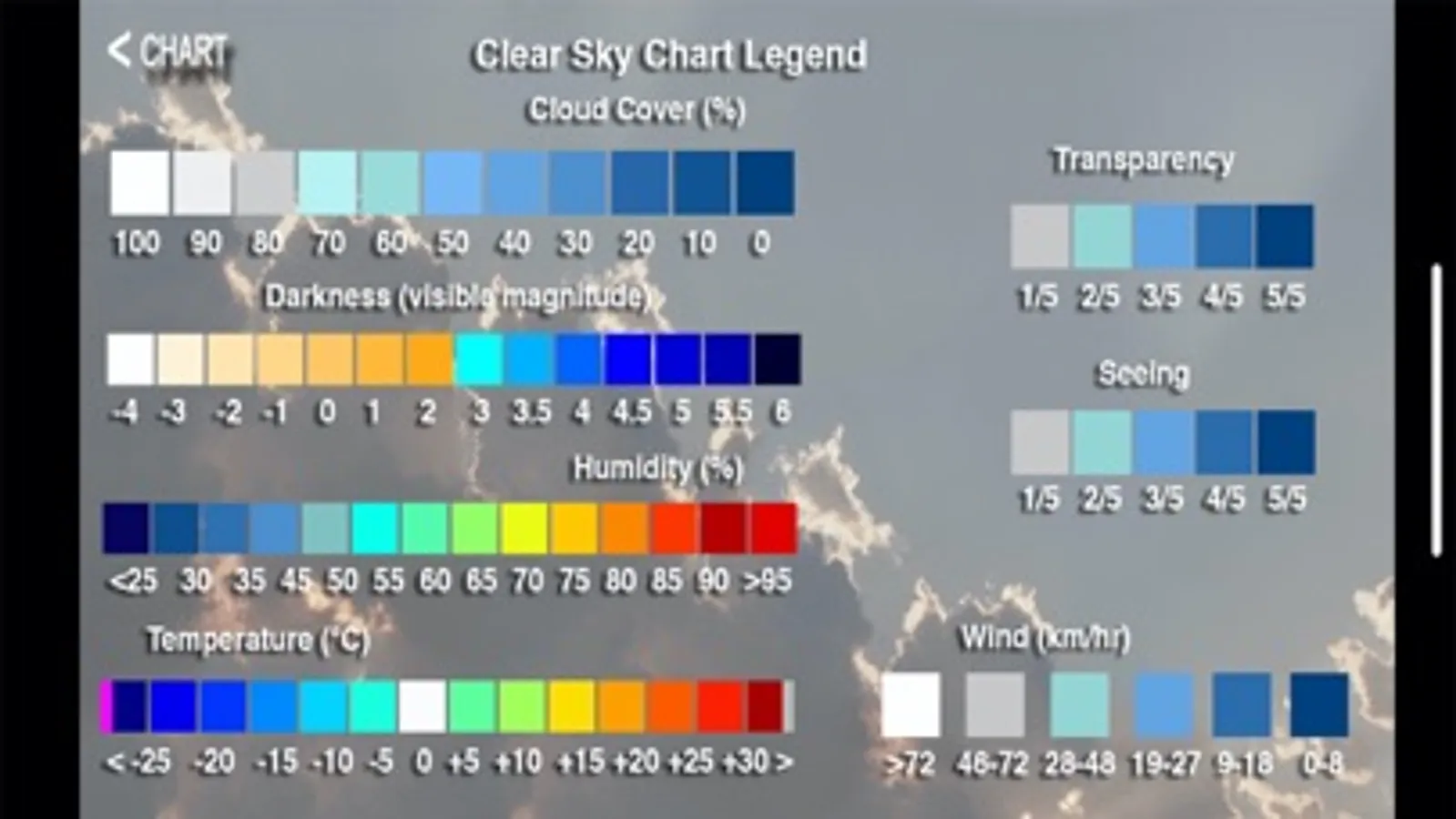 Carry your favourite Clear Sky Charts (CSC) in your pocket! Amateur astronomers in North America monitor local sky conditions using the CSC web sites which provide a very detailed 48 hour color coded observing forecast chart for cloud cover, transparency, seeing and other factors. This app contains a database of more than 6000 forecast locations in Canada, the USA and Mexico and can check for new updates. The launch screen monitors up to four or five favourite observing locations. Each square represents one hour and the colors vary from dark blue (excellent) to white (very poor) conditions for observing. A red line indicates local midnight and there is a last updated timestamp. Tapping on any preview chart will open a menu of options that allows you to (i) see a more detailed chart with legend, (ii) map the chart location, (iii) open the CSC web page, (iv) select a different chart location to monitor, (v) remove unwanted charts or (vi) share one of your charts via email, text message or social media. Locations Services can help you find nearby CSC locations when you travel.