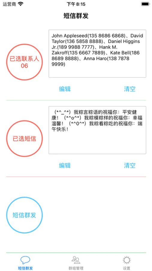 • 在同一个页面进行选择联系人、短信内容功能,最快30秒完成群发操作