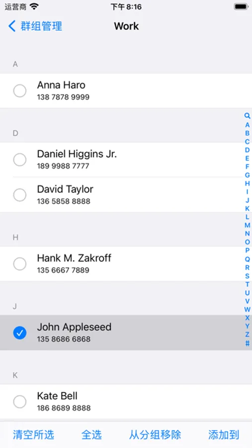 • 支持直接对通讯录的分组进行修改、删除、添加移除联系人的操作